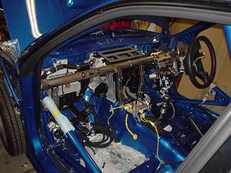正確には準グループNでしょうか。国際ラリーで実際に使うわけではなく、究極の練習車が欲しい!という要望にお答えしてグループNと同じ溶接ロールケージ(2002年スバルラリーチームジャパン仕様)で同じ手法で製作しました。溶接ロールケージはボディにぴったり沿うのでAピラー付近の視界はノーマル車とほとんど同じですっきりですよ。そしてエアコン付、オーディオ付です。究極ストリートですから。(2004/9/14)