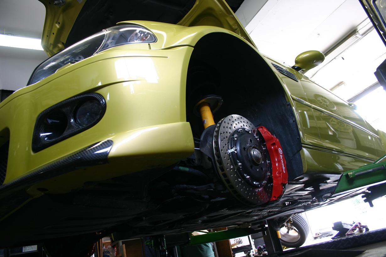 それにしても、E46M3ともなると、このくらいのブレーキサイズがあまりに自然すぎる姿なので一度装着してしまうともうノーマルキャリパーの姿には戻れませんね・・・(笑)