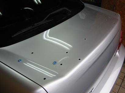S203タイプのウィングをオリジナルで製作しました。さっそく完成品をチェックをかねて、デモカーをつかって装着確認。これが純正の大型リアウィングを取っ払ったところです。