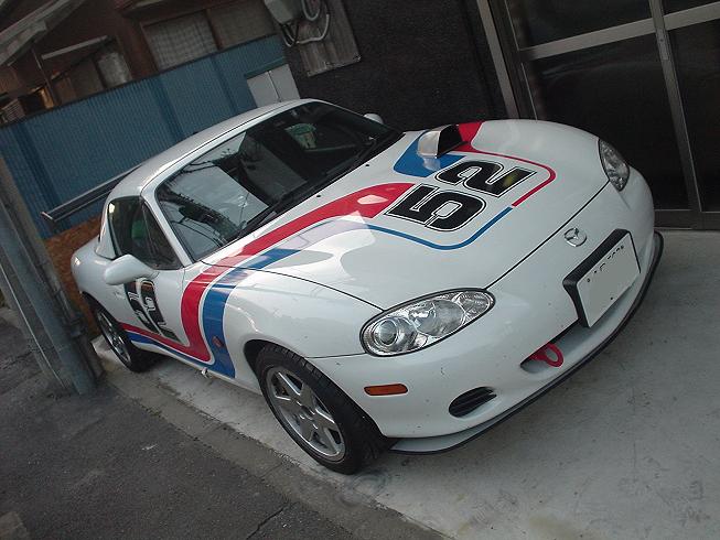 そして、最後の仕上げ!?にカラーリング。オーナーの希望で、マスタングのショーカーのレプリカ!?です。でもアメリカンな雰囲気がロードスターにぴったりで、妙に印象的なマシンになりました。最近、A/m/sではカラーリング車両比率が最近ジワジワと拡大中。モータースポーツはやはりカッコも楽しまなくては。