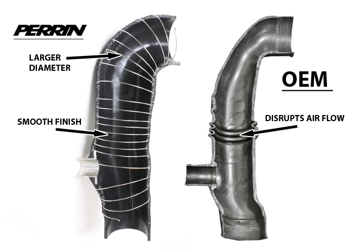 →先行して好評発売中のインテークパイプ。ターボ前の吸気抵抗を限られるスペースで極限まで減らしたタイプです。ハイクオリティながら既存の商品と比べてリーズナブル設定なのがお勧めです。高回転でのパワー間が断然違います。
