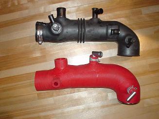 写真はグループNのために開発されたといっても良いだろうエアインテークダクト。アフターパーツでもよく見かけるが、これはグループN用。写真の右がエアクリーナ側、左がターボ側。実はこのパーツはFIAの公認パーツなんです。